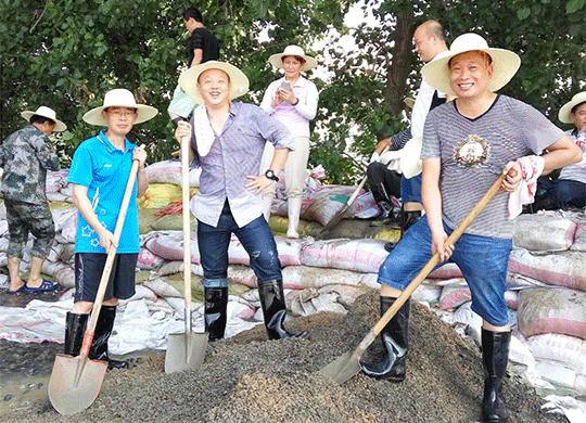 汗流浹背的龍總,正在搶險現場指揮協調中,扛沙袋、鏟沙、灌裝、碼防洪沙袋,哪里有需要,哪里就有龍總的身影!